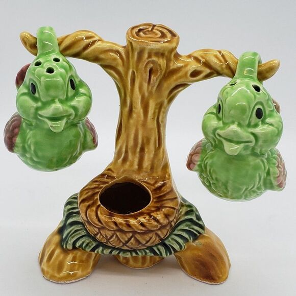 Good condition with one shaker having two small superficial chips under it's tail. Approx. size: 3" (w) x 5" (l) x 4.5" (h). Adorable complete set of salt & pepper shakers & tree trunk toothpick holder that is both fun &useful. Vibrant green colour of birds & realistic brown tree trunk & branches makes this unique kitchen accessory a must have for any kitchen or addition to any S & P collector's collection.