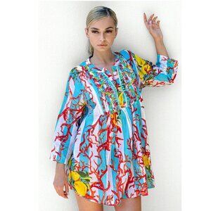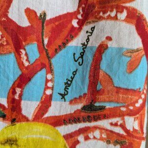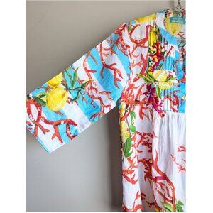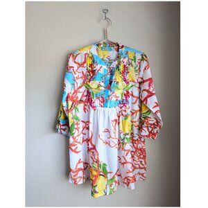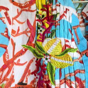 100$ cotton, lightweight like linen. Lemons and coral on white and blue stripe. Emboridered lemons on the front, mismatched coloured buttons. 3/4 sleeves. Collarless. Imo not quite long enough to be a dress - would be great paired with white jeans / shorts.