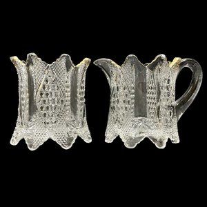 Add a touch of old times charm to your table setting with this Antique 1896 Carmen by Fostoria 575 Panelled Diamond butter dish, spooner, creamer & Sugar Set.