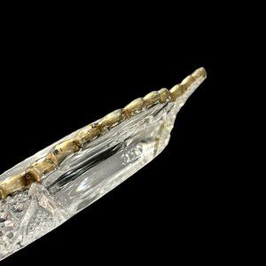 Made of clear glass with an art deco style, this set includes as a delicate gold trim all around the rim and edges.