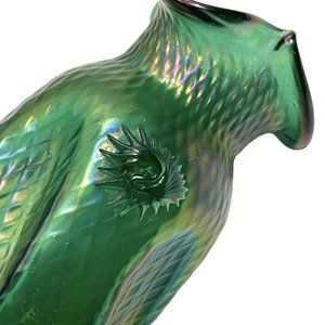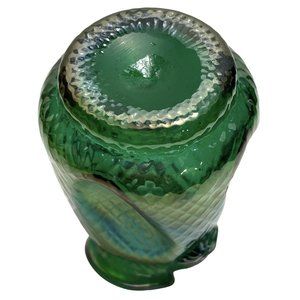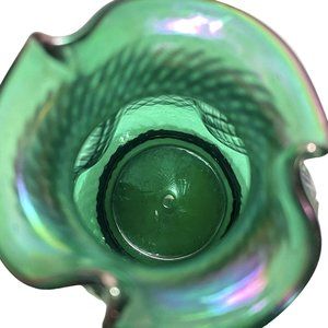 This antique vase from the early 1900s is a beautiful example of Art Nouveau style. This hand-blown glass vase features a unique green iridescent finish and an abstract art design.
