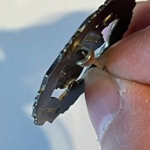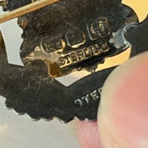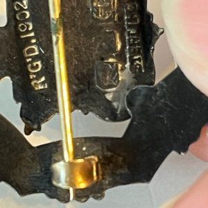 There are several silver hallmarks on the back of the pin , including a ''c'' beside the sterling stamp dating this to 1902. There are 3 stamped markings in the back. One of the side view of a lion signifying 925 sterling. there is also a sideways anchor marking which i believe signifies this pin/brooch was made in Birmingham.