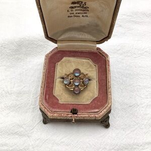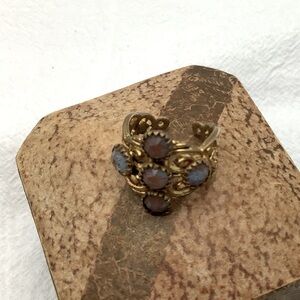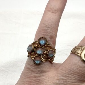 Ok we aren’t playing here. This beautiful 19th century saphiret glass ring is an incredible find. One of my personal pieces I have had for years. A brass setting with a light gold overlay. The saphiret are in beautiful vintage condition. Either you love it or you don’t.