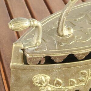 antique brass iron, Victorian decor, coal heated iron, 19th century collectible, brass home accents, steampunk decor prop, rustic brass decor, antique laundry iron, mantel display piece, historical collectible, gift