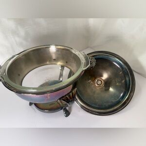 Antique 3 Piece Raimand Silver Plated 3 Footed Chafing Dish W/ Lid, Fire King