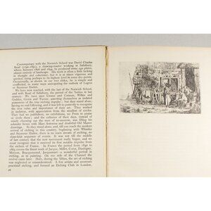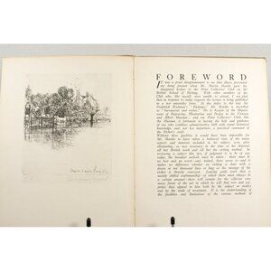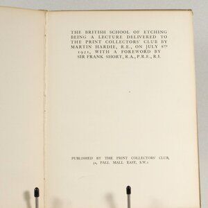 This is an antique book, "The British School of Etching: Being a Lecture Delivered To The Print Collector's Club" by Martin Hardie R.E. who was a curator at the Victoria and Albert Museum. It was published by The Print Collectors' Club in 1921. It is a brown hardcover book with black lettering and an orange cartouche on the cover. It has 33 pages and contains many Illustrations. Tucked in the back is a promotional leaflet for the The Print Collector's Club from the same time period.
