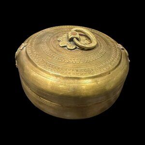 Bring a touch of old-world charm into your home with this antique brass chapati box. Traditionally used in India to keep chapatis (flatbreads) warm, this handcrafted brass container features a secure latch and a sturdy handle, making it both practical and decorative.