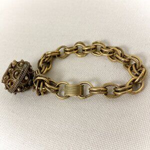 Antique Edwardian intricate chain bracelet with a dramatic filigree ball pendant with an Eastern looking quality, or even a Tanis root vibe from Rosemary's Baby if you get the reference! The chain has solid and striped links and the ball is very detailed. It has the appearance of a locket but it does not open. Unmarked.