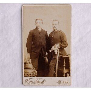 A wonderful carte-de-visite or photographic calling card of 2 men (twins) with moustaches. One is in uniform. By photographer Osw. Schidt in Pirna. On the reverse there is written: Meine Onkel (my uncles) Richard Habermann, Theodor Habermann 1893. Overall in good condition with age related wear and some fading.
