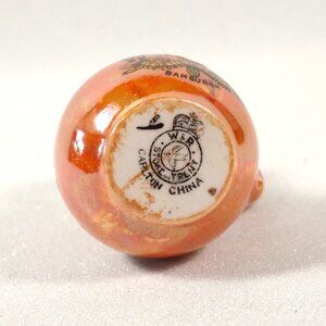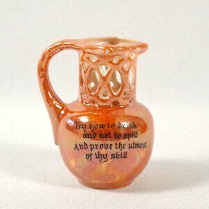 Here is a rare Carlton China Crested Souvenir in a peach Luster glaze instead of the usual white. It takes the form of a miniature puzzle jug with the crest and motto of Lord Armstrong of Bamburgh Castle from between 1906 and 1926. On the back is a little poem challenging the reader to drink from the jug without spilling.