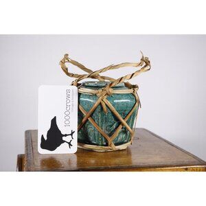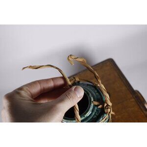 This one looks to be ca 1910 - 1920s, judging from the colour of the unglazed bottom, and is a vibrant green-blue with plant motif panel sides. The bottom is unglazed and there are no makers marks. It is in good condition without cracks or chips, there are some charming irregularities due to the handmade nature of the pot. It has the straw work cage and the original handles. The handles have been bent flat and dries in this position, one of them split at the top.