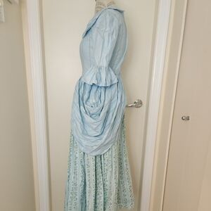 Blue stripe over aqua blue floral Circular Flounce Half Sleeve Low Round PeterPan Collar Colonial Prairie dress with hip bustle.