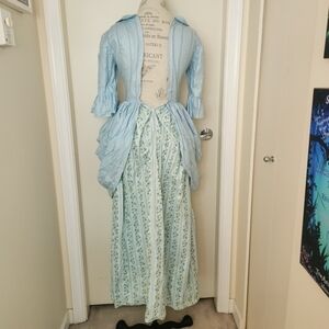Antique late 1700s costume Period Piece (Hamilton era), Vintage made in 1930s probably as a set/stage piece, smooth action "Flash" back zipper, 'Forget Me Not' Floral Pattern, Excellent Vintage Condition, one very light stain on right arm, 100% Cotton, No Tags, Size XS, PtP-17, Waist-12 1/2, Sleeve-14, Length-53.