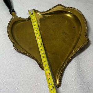 This item is a vintage or antique crumb catcher, made of brass, and featuring decorative elements including the heart shape, wood handle, and beaded edges.