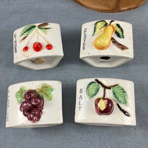 Antique Curved Spice Rack, Ceramic & Wood Wall Mounted with 6 Compartments, and 4 ceramic spice holders. The ceramic shakers are hand painted, made in Japan. To be used as decoration only as the ceramics are fragile antiques, and the painted surface should be wiped clean with a damp cloth only (not soaked or scrubbed). Cork stoppers are missing on 2 of the spice shakers. Rack is 6" across by 6" tall.