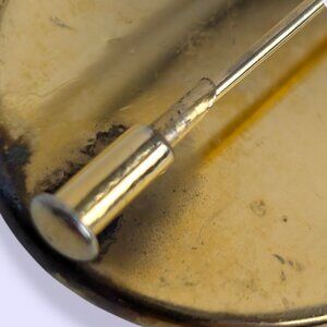 This antique damascene brooch has a barrel pin clasp closure and is stamped VL on the clasp (most likely for Valencia, Damascene capital of the world). The brooch has a dark front with gold and silver accents, and a flat gold tone back. There is tone loss and darkening around the barrel end of the clasp, and some general wear and minor tone loss throughout.