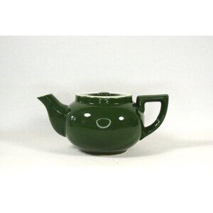 This is a charming little teapot from the 1920s. The background is a dark green color with white interior and rim around the top of the pot and the spout. The right angle handle speaks to the art deco style of the period.