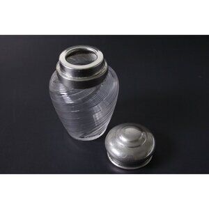An antique Dutch clear glass and silver toned metal tea caddy, or storage container from the Northern regions of the Netherlands. The lid simply slips off and stays in place well. The silver toned metal is a silvered tin (not precious). Overall this item is in great shape with a few fleabites to the bottom rim and some denting to the lid (see images).