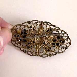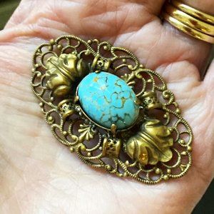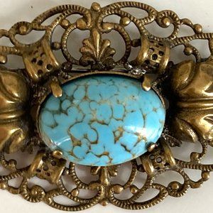 A finely detailed piece from about 100 years ago, with a gilded turquoise coloured stone framed in francy openwork brass. It measures 2 inches by 1-1/8 inch and has a tight C clasp. In excellent condition. While there are no markings, this piece looks much like another in my collection that was made in Czechoslovakia. (d)