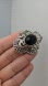 The contrast between the deep black stone and the intricate metalwork gives it a timeless, sophisticated charm.