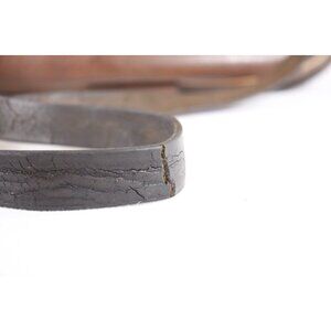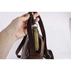 Condition: The thick outer saddle leather in decent condition with discolouring and a bit stiff from disuse. The caramel toned piping along the edges partially missing. The brass frame with signs of age including greening and denting. The top button a little stiff but opens fairly easily with help of the side flap, and closes securely. The inside pockets with repairs as shown to the top and a large hole in the bottom of one of the side pockets. The shoulder strap may have been a part replacement - the white metal on the rings and buckle do not match up with the brass frame, but the leather looks period-correct. The shoulder strap with cracks and 1 section in particular looks like it could break soon.