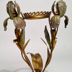 Absolutely beautiful gilt bronze antique art nouveau candle holder with delicately painted iris flower motif! Each flower can hold a tapered candle, the middle can hold a bowl or larger candle in glass. The reeds have a lovely intricately etched texture. Has some wear from age as shown but that adds to its antique charm. The bottom can be unscrewed for easy shipment.