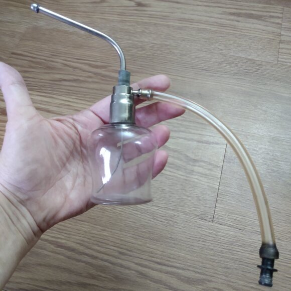 Fairly good used vintage condition. For display only. The rubber cylinder on the top nozzle has dried out. The metal has corrosion. The glass seems to be intact with a little scuffing, scratching etc. There are parts missing.