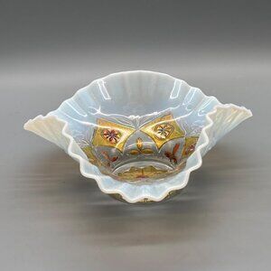 Antique Goofus Glass Bowl Opalescent Ruffled Edge Hand Painted Red Gold Floral