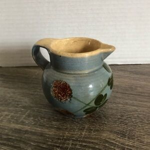 Enhance your home decor with this handcrafted ceramic pitcher. Featuring a soothing blue hue with green and brown clover flowers, this piece adds a touch of elegance to any room. Based on the characteristics I would say this piece likely dates to the late 19th/ early 20th century. Would have likely been used for milk or cream. This is an adorable little accent piece to bring the country rustic vibe into any home.