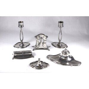 A gorgeous pair of Jugendstil candlestick holders by renown German maker WMF (Württembergische Metallwarenfabrik) in a simple pattern and of good proportions. With little curly accents on the feet and simple swooping art nouveau lines to the pierced stems. Perfect to keep in your living room on the mantel, or to use during a fancy dinner party. Or keep them in the office - I have a few pieces available of this same pattern.