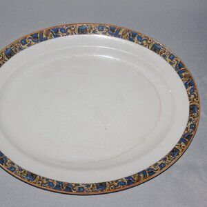 The potter's mark on this platter dates the piece to 1907+. The rim has a colourful hieroglyphs design, with especially the blues remaining bold and vibrant. For an antique, the overall condition is good, without any chips. There is a visible hairline crack, with no discernible edge to the crack. Some crazing as well. The price has been adjusted for the condition.