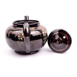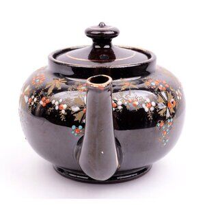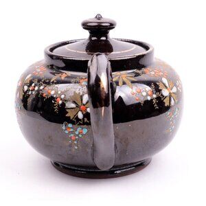 Black glazed Redware moriage hand-painted gold, orange and white glaze - formed from red clay.