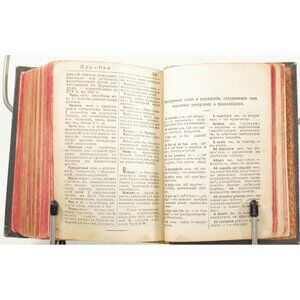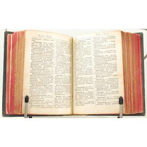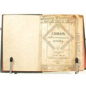 This small antique book is a Russian Dictionary of Foreign Words used in Russian Language by N. Gavkin, published in 1913 by the south Russian publishing house of F. A. Ioganson. It is a small black hardcover book with gold lettering on the spine and red color on the edges of the page block.