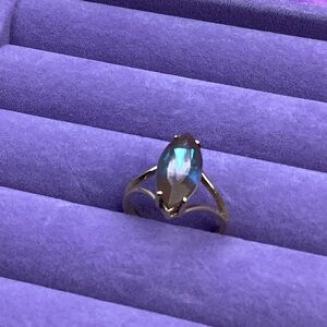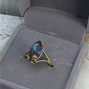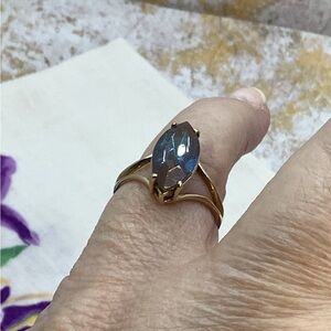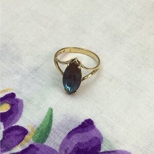 This stunning women's ring features a captivating saphiret set in a 10 kt gold shank. It’s a size 6 and in beautiful vintage condition. Great flash in the stone. saphiret was created by pouring pure gold into blue glass. They are very rare. Keep in mind this is not a gemstone. It's glass and can break like glass or opal. It's not an everyday piece. Don't wash dishes with it on or hit it too hard. This ring is a specialty piece.