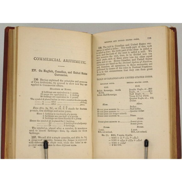 It is a red cloth bound hardcover book with black lettering and graphics on the cover and spine and gilt lettering on the spine. It is divided into two sections, Pure Arithmetic and Commercial Arithmetic, for a total of 347 pages plus ads .
