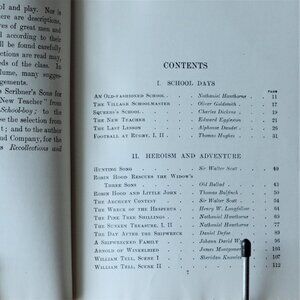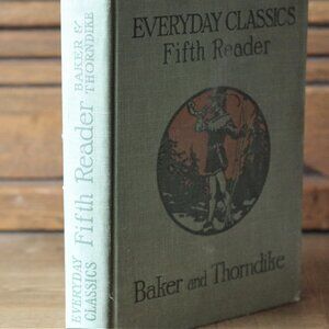 This is a vintage school textbook based on classic literature, "Everyday Classics Fifth Reader" by Franklin Baker and Ashley Thorndike. It was published by The Macmillan Company in 1928. Please see the photos for the full table of contents. It contains excerpts from the literary classics by Dickens, Hawthorne, Scott, Defoe, Wyss, Longfellow, Eliot, Browning, London, Tennyson, etc.