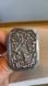 Vintage silver brooch identified as an antique .800 silver repoussé opium box top with brooch clasp; likely from the Morocco Ottoman Empire period, dating between 1900-1910. The object's form and related search results indicate it was the top of an opium box, with intricate storytelling scenes. The design features a tree with fruit, figures, and architectural elements, characteristic of the repoussé technique used in metal embossing.