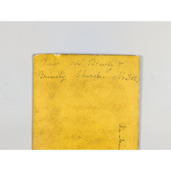 A nice early Stereoscopic photography card featuring The View on Broadway and Trinity Church, looking Southward down Broadway. The yellow fronted card stock is unmarked for a maker or publisher and the back has been written by hand. Possibly by an amateur photographer, but a nicely composed image. The Albumen photographic images are fairly sharp with decent contrast, even though the is some staining and damages to the card and image.