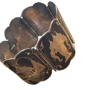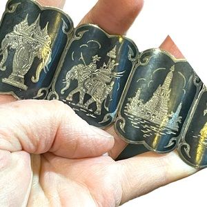 Antique Sterling silver Siam Etched black wnamel symbols Thai bangle bracelet