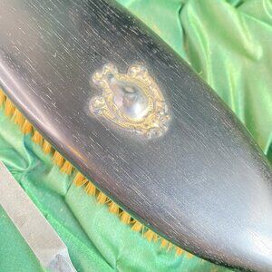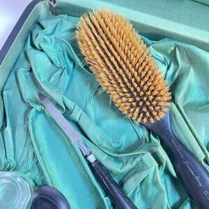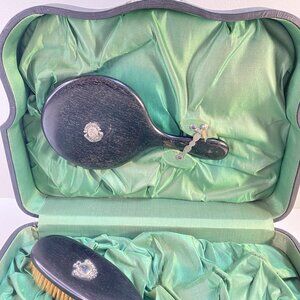 This elegant Victorian vanity set is presented in a black leather-covered case with ornate silver-tone hardware and green satin lining. The set includes ebony grooming tools—such as a hand mirror, hairbrush, and additional fitted accessories—all adorned with decorative silver medallions. The lower drawer provides extra compartments for small essentials, while the satin interior cushions and showcases each piece beautifully. The black leather exterior and rich ebony tools make this a striking display piece, both timeless and dramatic. Light wear consistent with age but overall exceptionally well-kept for its period.