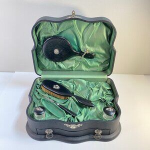 Antique Victorian Era Vanity Ebony and Silver Dresser In Leather Box