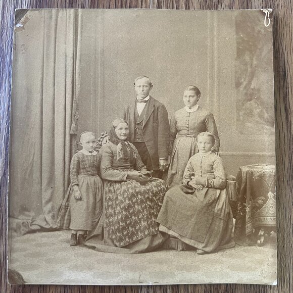 The ladies are wearing dresses with aprons and the Father has on a 3 pc suit, bowtie and pocket watch chain. The Grandmother is wearing a headscarf. Mother has a lace collar and brooch.