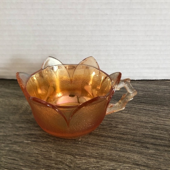 Beautiful marigold carnival glass mug shaped as a tulip with a twig handle. Perfect for shelf decor, trinket holder or would be super cute as a candle holder. Based on research, this was made in the early 1900’s by Westmoreland.