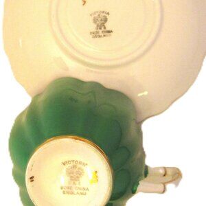 Antique circa 1912 Victoria C & E emerald green bone china teacup & saucer, England. Teacup & saucer is scalloped & ribbed with gold edging. Such a special china teacup and saucer it reminds me of another artistry pottery and produces the Shelly bone china, but there is no history of a connection between the two.