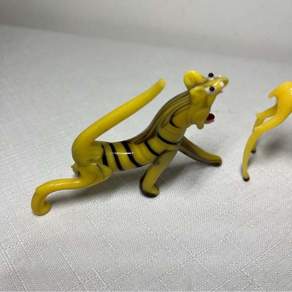 Antique blown glass animals - giraffe, a striped yellow tiger, and a charming blue elephant