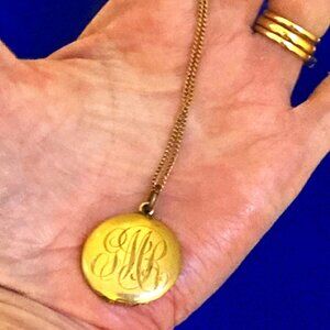This round locket, an inch in diameter, has an ornate monogram on one side (I think it is GMR) and the photo of a young child in one of the two places for photos. The Wightman & Hough mark - W&H Co. in a heart - is etched on the other inside face. The locket comes with an 18-inch chain with no markings.