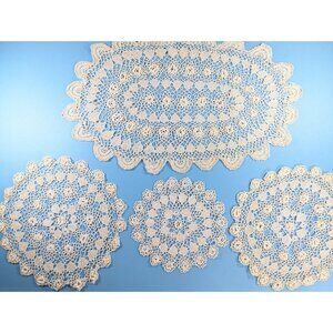 ...dainty fabric tray cloths bridal shower decor A matching set of 3 antique hand made Irish crochet doilies + 1 oval tray cover. The work has been made with a fine hook and thin thread, resulting in classic delicate end pieces. It features flower motifs connected with piquot brides and 3d flowers. The smallest piece is ca 7 inches (18.5 cm) in diameter and in nice condition without stains or obvious discoloration. Perfect size for under a teacup or candlestick. The mid size (2 pieces) are 9.5 inches (24 cm) in diameter. 1 with a few small stains, and both seem to be a touch whiter in the centre than on the surround. These are a great size underneath a small planter or teapot. The largest in an oval shape of ca 17.5 x 11 inches (44 x 28 cm. There is very faint staining and some discoloration towards the edges. I spotted 2 little broken threads. Perfect to add to a serving tray, tea cart or sideboard. **My photo props (Beatrix Potter tea service pieces) are not included in the sale of this item.