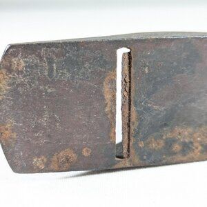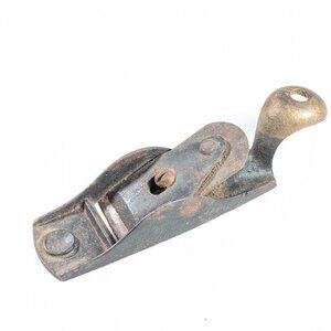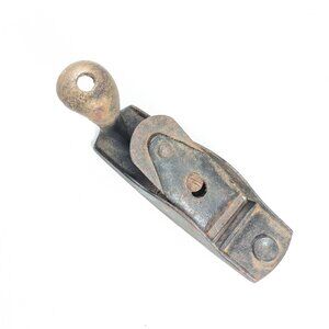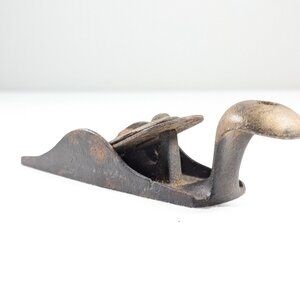 An antique block plane hand tool, named for the shape of the tail end. With rust as pictured, would make a good prop or decor piece.