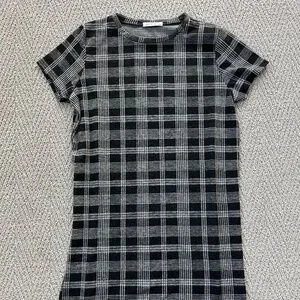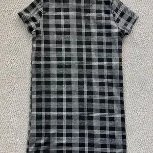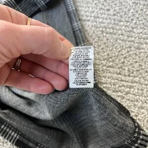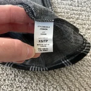 Size XS, made in Canada, polyester/rayon/spandex blend with brushed outer fabric. Longer style, looks great with leggings. Hardly worn, just too tight on me