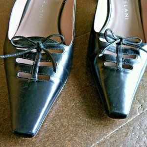 Antonio Melani Women's Glove Fit Black Leather Square Toe Ankle Strap Heels Bows